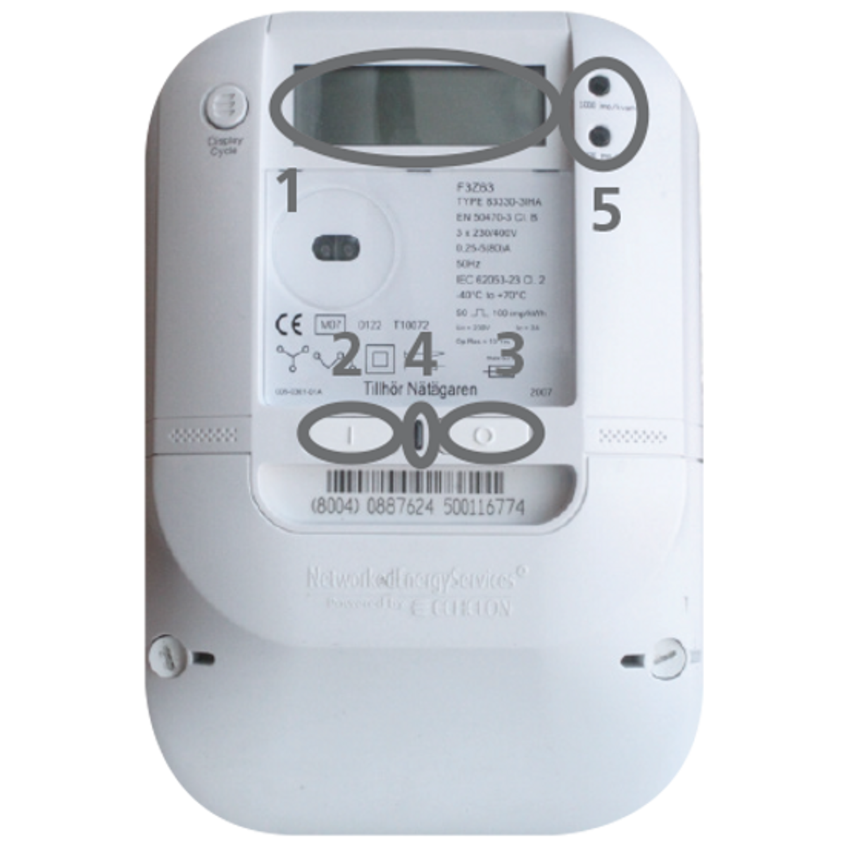 - Display, här visas aktuell mätarställning i kWh