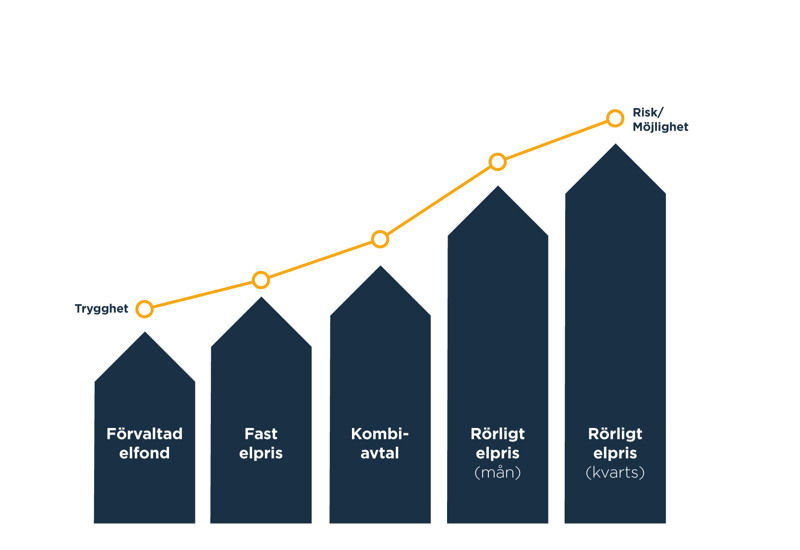 Företagare förknippas ofta med en vilja att våga ta risker, nästan en förutsättning för att växa. Men det betyder inte att du alltid vill chansa när det gäller dina elkostnader. När du tittar på alternativ för elavtal ska du därför också fundera över din risktolerans. Klarar du ovissheten och är bekväm med att priserna svänger kan ett rörligt avtal (spotprisavtal) vara det rätta valet för dig. Är du däremot en person som vill ha kontroll över dina kostnader kan ett kombiavtal bli en bra ”match”. Kombiavtalet ger stabilitet och förutsägbarhet och du slipper obehagliga överraskningar som kan uppstå vid oväntade prishöjningar. Vill du ha stor förutsägbarhet och möjlighet att budgetera dina elkostander är troligen förvaltad elfond eller fast elpris ett bra val.