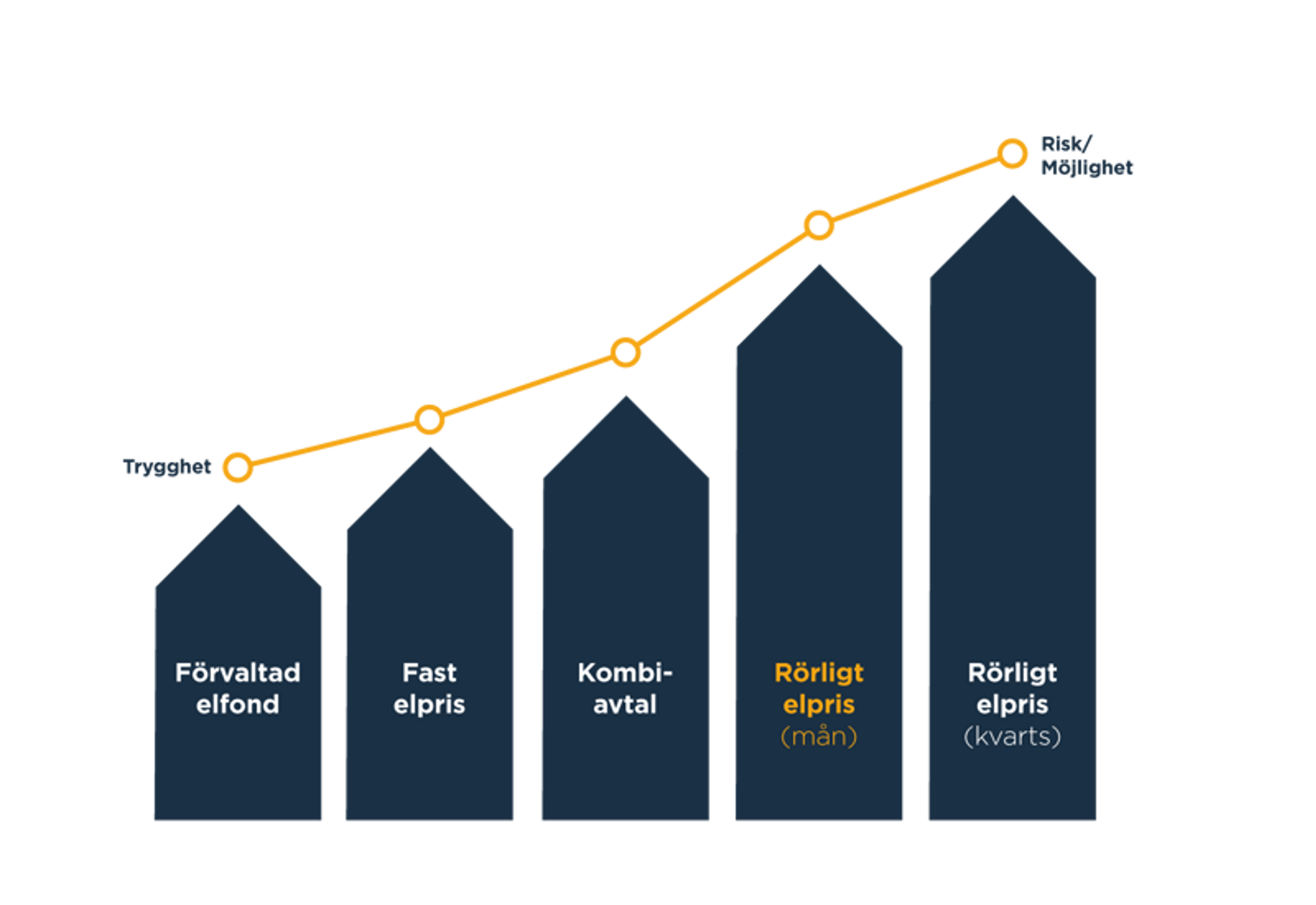 Att ha ett rörligt elavtal innebär att kostnaden för den el du använder förändras och följer elmarknadens både upp- och nedgångar. Rörligt elpris passar bra för verksamheter där elprisets påverkan på företagets produkt eller tjänst är liten. Eller verksamheter där det inte finns något behov av att mer detaljerat budgetera för elkostnader. Rörligt elpris kan vara aktuellt för såväl den lilla elförbrukande verksamheten som den med betydligt större elåtgång. För mätare med månadsavräkning sker prissättning enligt volymvägt månadsmedelspotpris och för mätare med timavräkning. sker prissättning enligt timspot.